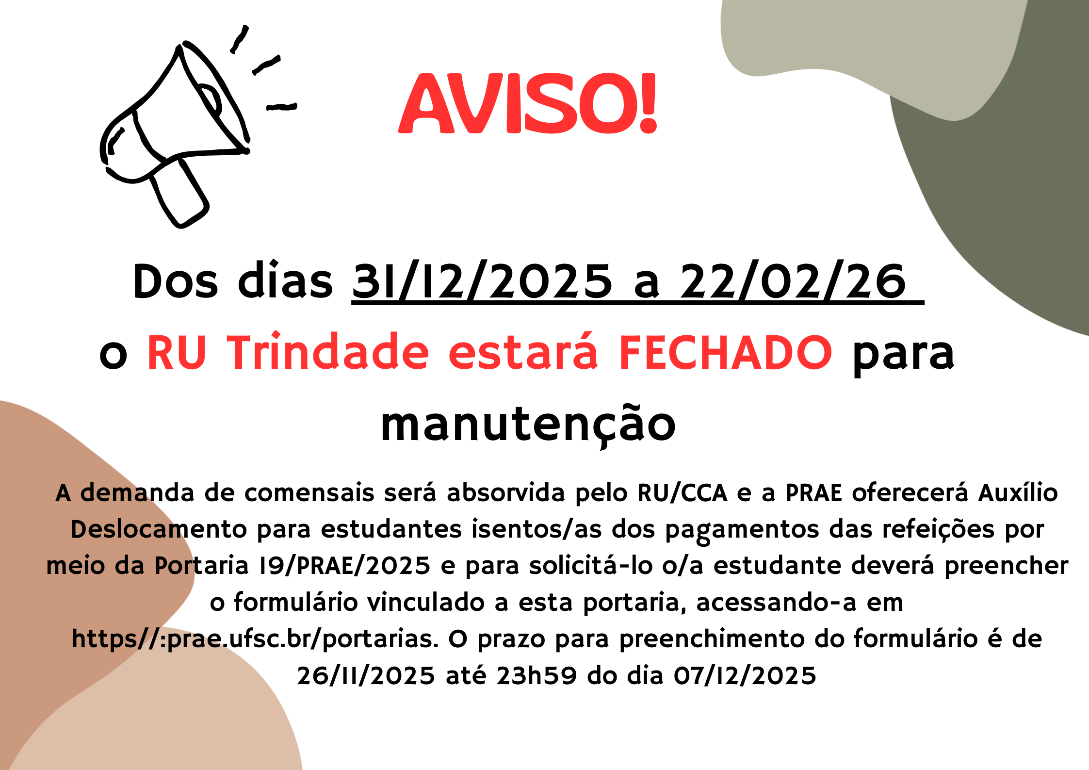 O Restaurante Universitário da UFSC do Campus Trindade, em Florianópolis, passará pela oitava etapa do plano de manutenção contínua e estará fechado de sexta a segunda-feira, 24 a 27 de outubro, para almoço e jantar. O Restaurante Universitário do Centro de Ciências Agrárias (CCA), no Itacorubi, estará aberto para atender à comunidade da UFSC Trindade.
